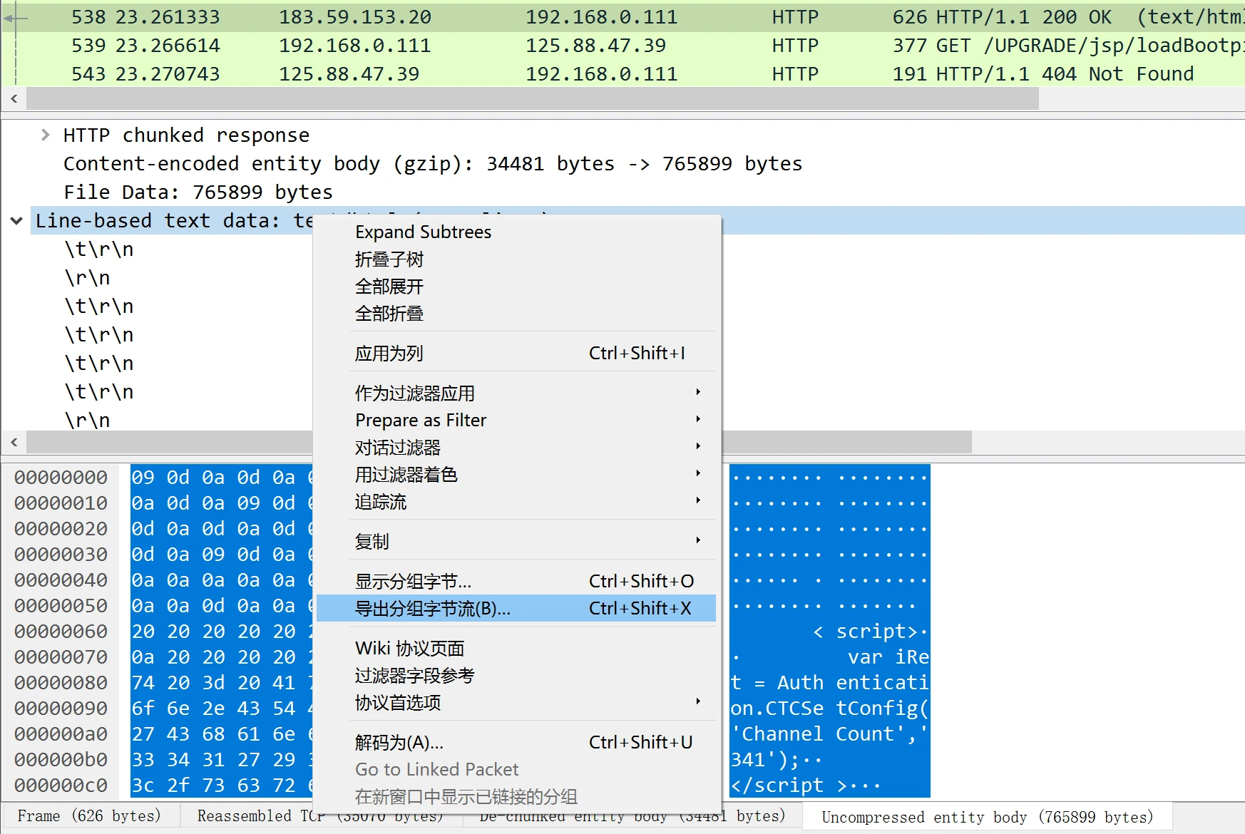 然后跟着下面找到返回包,在 Line-based text data 上右键,导出分组字节流。导出文件名就叫 channel.html