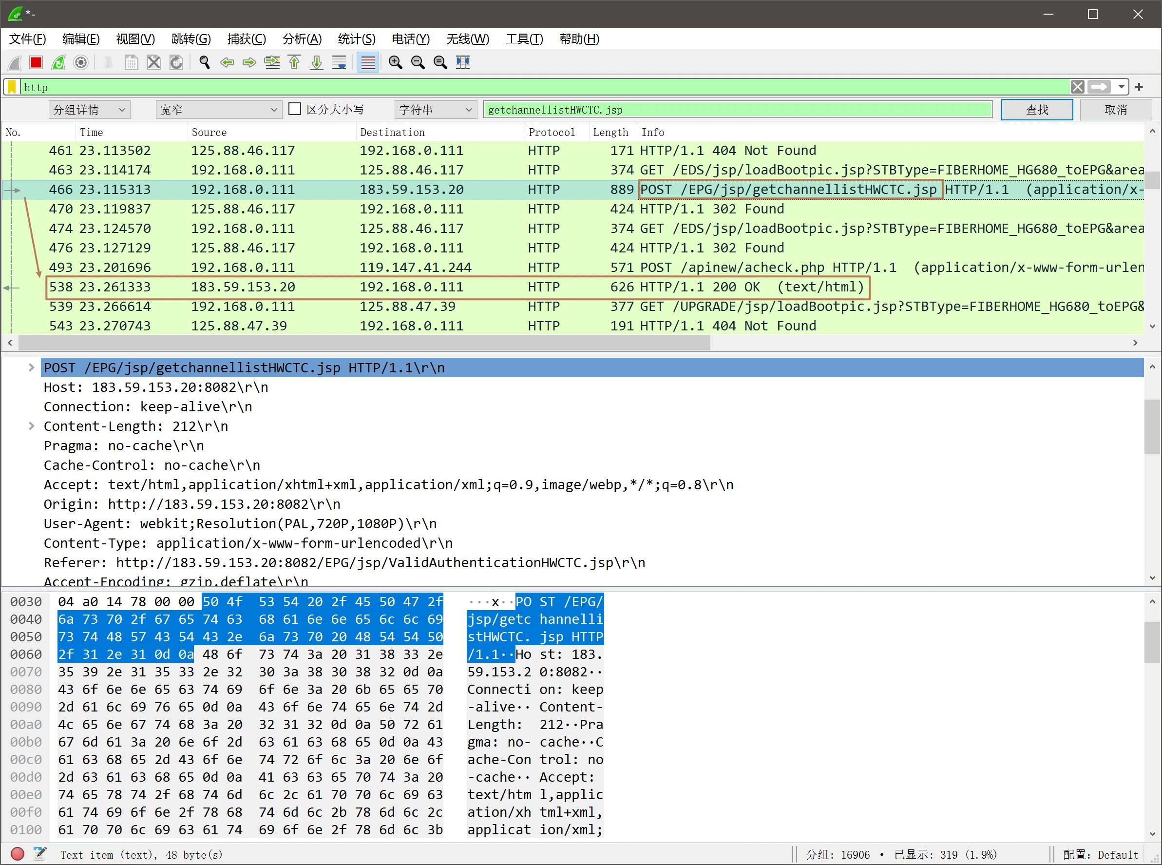 抓到完整过程的包之后,找到 POST /EPG/jsp/getchannellistHWCTC.jsp 这个请求
