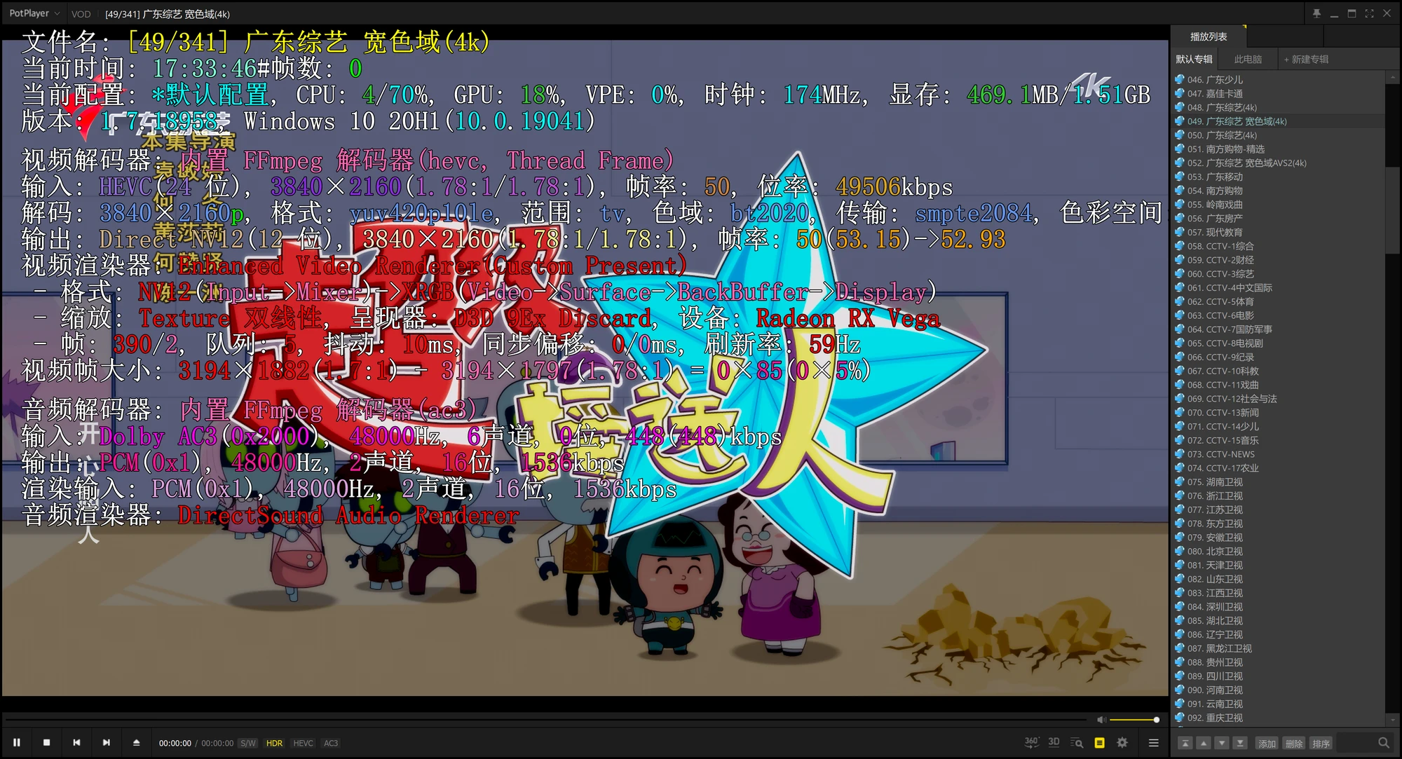 最后,使用 PotPlayer 即可正常播放,其中有个别台看不了属于正常现象,因为它们用的是AVS+和AVS2编码(比如CCTV5超清、广东综艺宽色域AVS2)。关于这一点,我做过测试:gitee 上有人编译的支持 AVS2 的 FFMPEG 和 VLC 也依然不能正确转码、播放这些台。如果有人测试成功了,欢迎留言告诉我你是怎么在电脑上正常播放的。目前来看,只有使用国产SoC的电视盒子才能正常硬解观看这些频道。